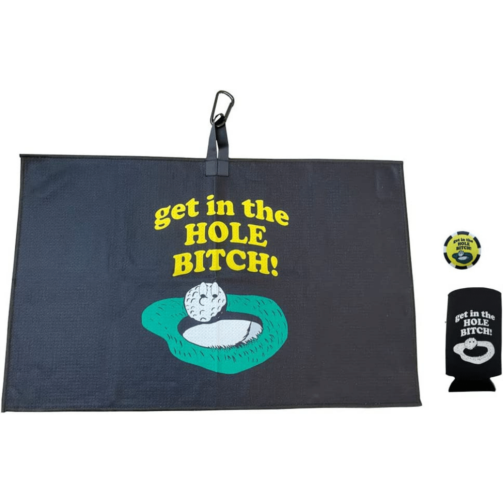 The Giggle Golf Towel is made of super soft microfiber, making it ideal for wiping away dirt from your clubs. The black waffle pattern and funny design are trendy and stylish and are sure to make a statement on the green. The Get In The Hole Bitch Poker Chip is one golf accessory that's sure to be a hit with any golfer. And it also comes with a lightweight foam-constructed cooler for your favorite beverage in a can.