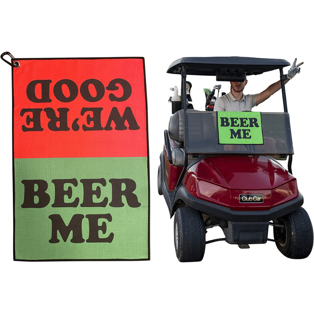 Looking for a way to keep your clubs clean and your cup holder full? Look no further than the TrueBirdie Golf Towel Beer Me! This versatile, dual-purpose towel is made of high-quality waffle-style microfiber that will make sure your clubs are always sparkling clean. But that's not all - on one side it says "Beer Me" in big, bold letters, so you can flag down the cart girl for a refill. On the other side, it says "We're Good", so she knows not to bother you if you don't need anything. Whether you're out on the course or relaxing at the 19th hole, this towel is a must-have accessory. So grab one today and keep your game on point.