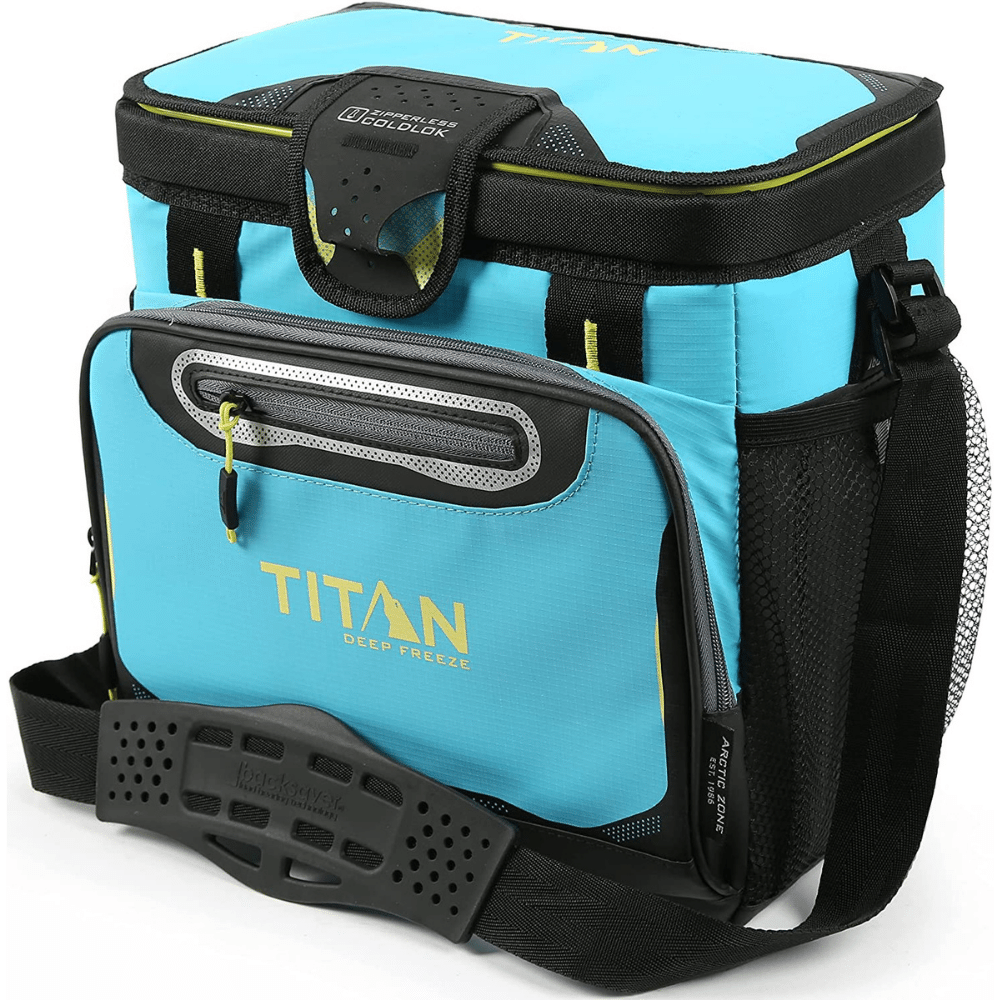 In addition to its impressive cooling capabilities, the Titan Deep Freeze Cooler also features a patented Zipperless lid that makes it easy to access your food and drinks. No more fumbling with zippers! The exterior of the cooler also includes an insulated front pocket, mesh side pockets, and water and stain repellent material that wipes clean easily. So whether you're on the golf course or ouit at the park, the Titan Deep Freeze Cooler has you covered.