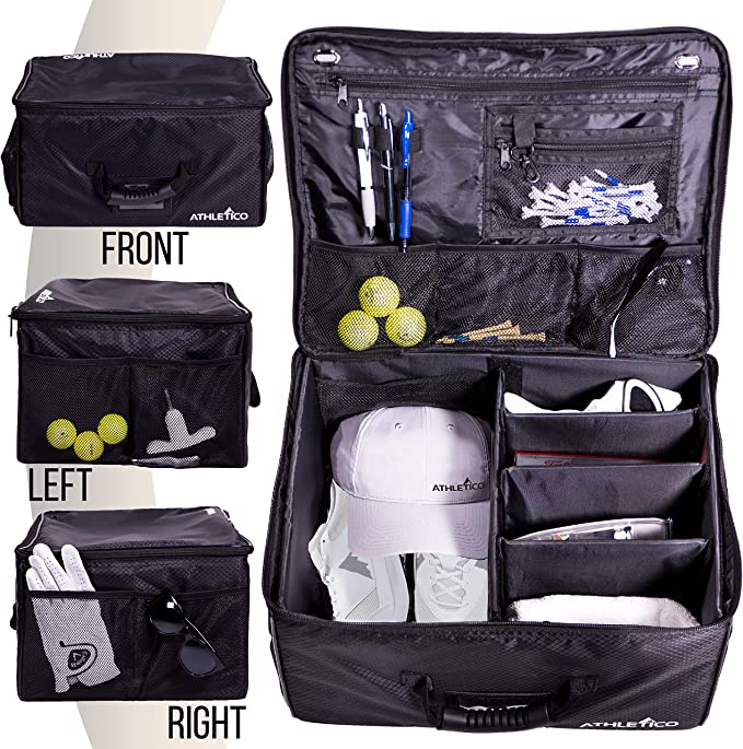 The Athletico Golf Trunk Organizer is an excellent way to store your golf gear and other accessories. The organizer comes with multiple adjustable dividers, so you can customize the storage to your needs. It's made with rip-resistant, water-resistant fabric and a premium rubber grip handle, making it durable and perfect for use in cars, SUVs, standard lockers, and gyms.