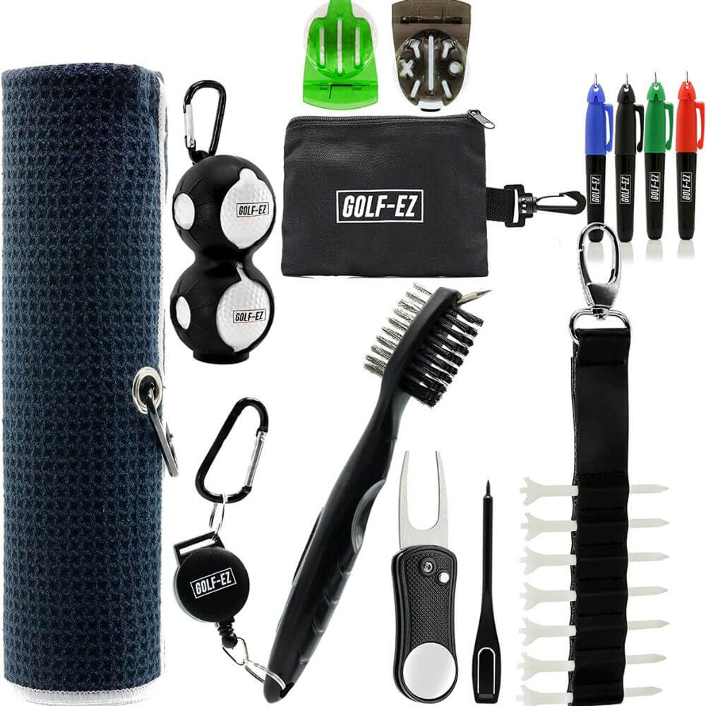 - Includes: Golf Towel, Golf Brush, Divot Tool, Putting Alignment Tool, 4 Piece Marker Set, 10 Tees, Pencil, Carrying Case, Golf Ball and Tee Holder