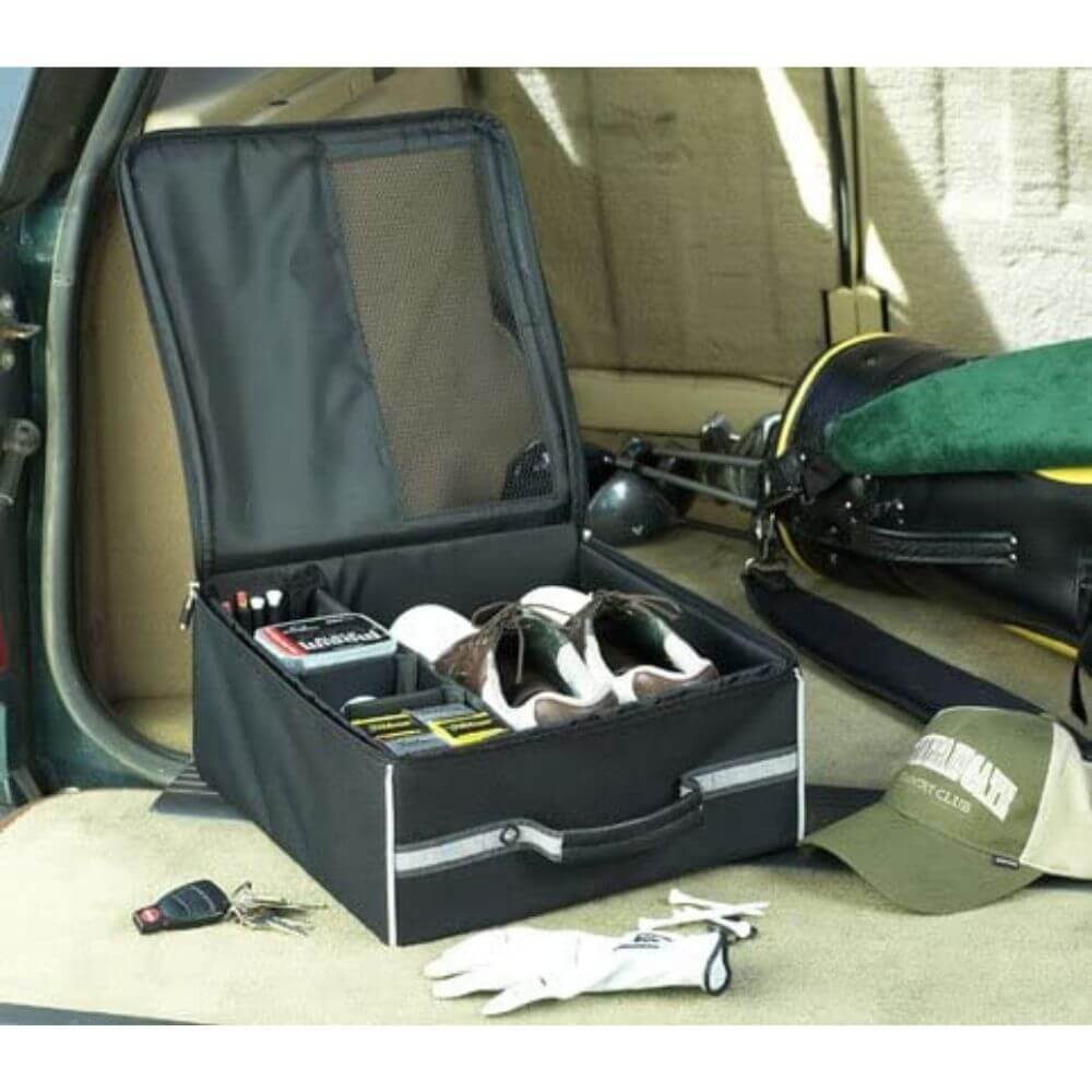 A golf trunk organizer is an ideal way to store and organize all of your golf gear. It can store golf balls, tees, gloves, golf shoes, towels, and other golf accessories. It typically has multiple compartments and pockets to keep everything organized and easy to access. Some trunk organizers even have special pockets designed specifically for golf balls, tees, and other small personal items. And even better some feature a ventilated compartment that can store up to 3 pairs of golf shoes.